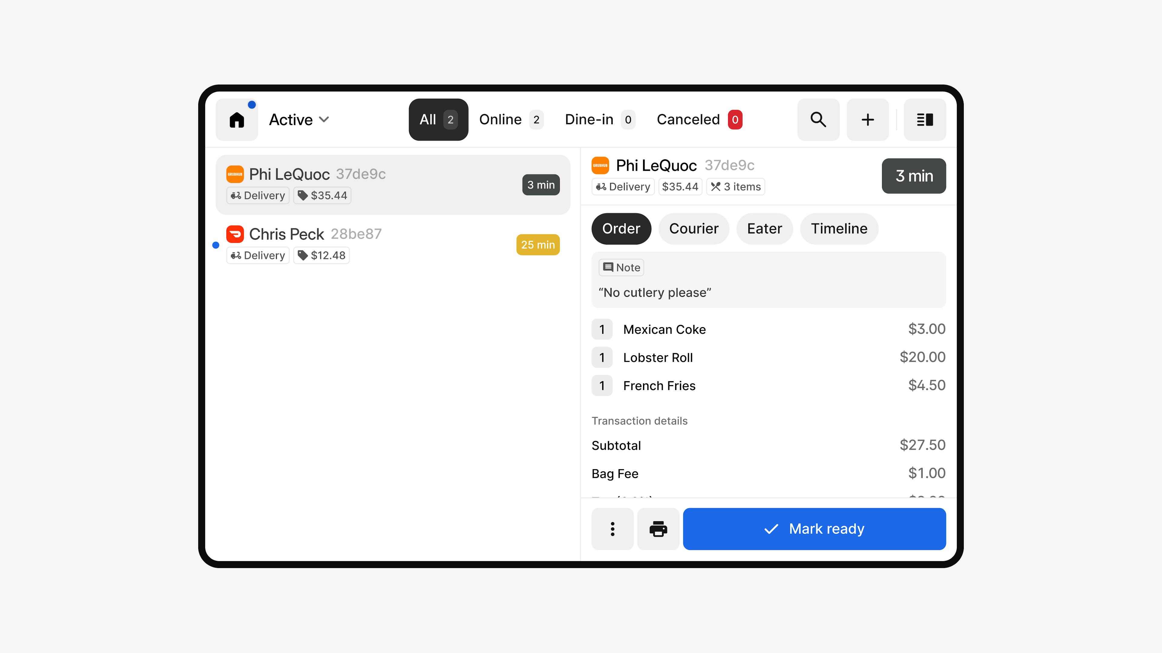 Delivery app, pick-up, and dine-in orders all in one tablet. Direct orders are also pulled right into the queue for easy order management.